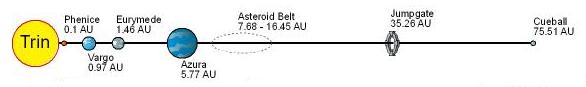 Sky-blue Azura is Trin's most distant daughter, a grand dame, beautiful yet aloof as she swings her majestic course around her mother. More than a dozen moons accompany her, a proper entourage for the great queen. Yet Azura is not suitable for life: the surface is made of a poisonous cloud of hydrogen and other light elements. Azura's rocky moons are the only surfaces fit for landings.